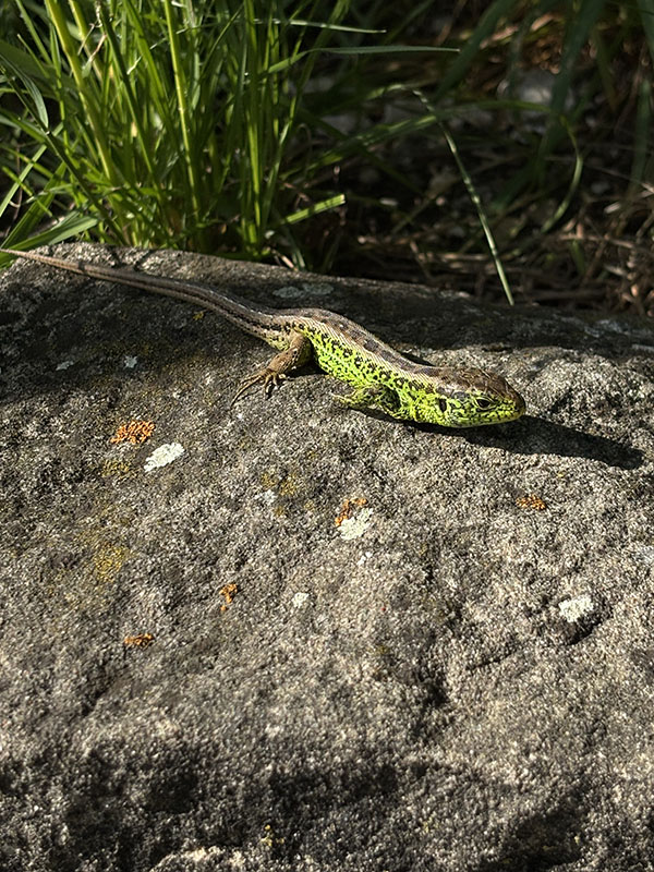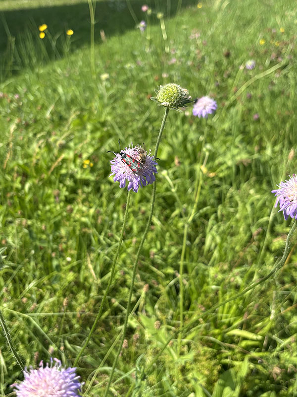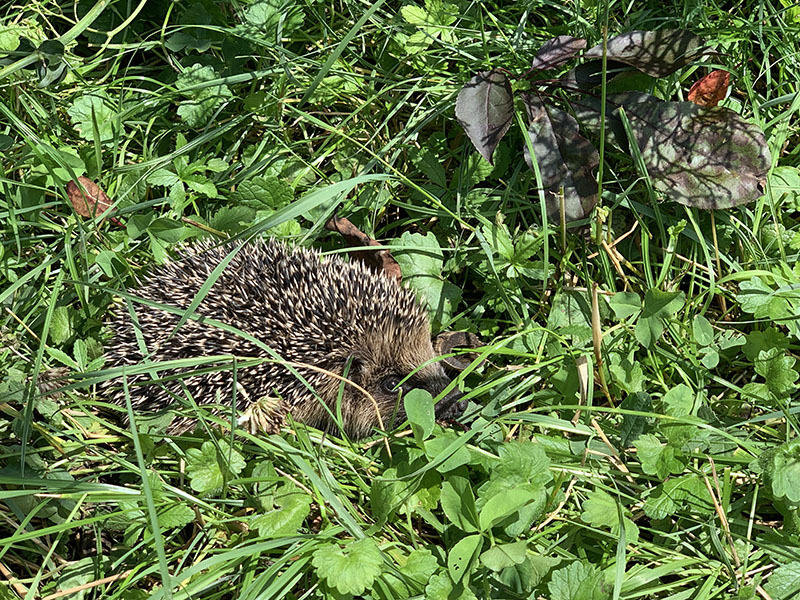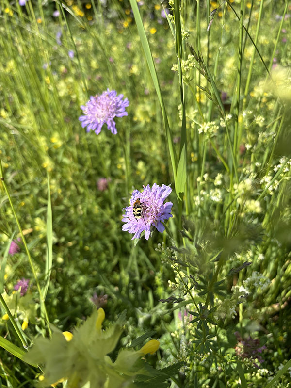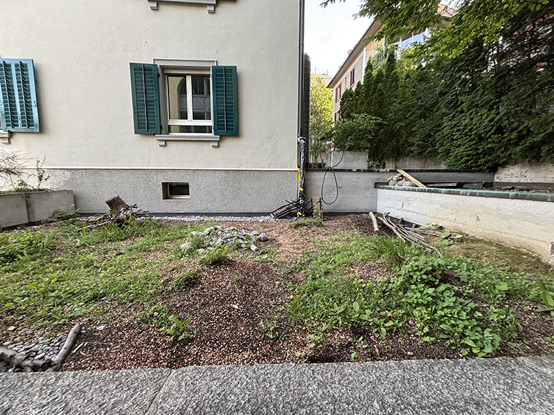 Ökologisch aufgewertete Dachfläche durch Ansaat, Initialpflanzung mit Wildstauden Anlegen von Steinlinsen, Totholzhaufen und Wildbieneninsel.