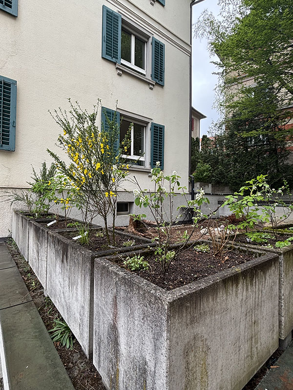 Ökologisch aufgewertete Trogbepflanzung aus einheimischen Gehölzen und Stauden